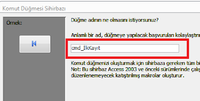 Bu pencerede 1 Nolu seçeneği işaretlediğimizde Düğme Üzerinde İlk Kayıt yazısı görünecektir. 2. Nolu seçeneği seçtiğimizde düğme üzerinde sol tarafta görünen resim görünecektir. Listede 2 adet resim görünmektedir. 3. Nolu seçeneği işaretlediğimizde MS Access’in içerisindeki tüm resimler listeye alınacaktır. Eğer bu resimlerden de istemiyorsanız 4. Nolu Seçenek ile (Gözat) Bilgisayarınızda bulunan 16x16 ebatında bir resim dosyası ekleyebilirsiniz. İleri Butonuna tıklıyoruz, gelen pencerede Komut Düğmesini isimlendirmemizi istiyor, burada düğmeye göreviyle ilgili bir isim verirsek daha sonra bulmamızda kolaylık sağlayacaktır.